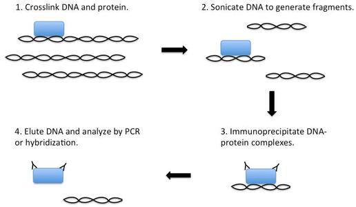 染色質(zhì)免疫沉淀技術(Chromatin immunoprecipitation assay, ChIP)是研究體內(nèi)環(huán)境下DNA與蛋白質(zhì)互作的方法,常用于體內(nèi)轉(zhuǎn)錄因子結(jié)合位點等方面的研究。其基本原理是在活細胞狀態(tài)下固定蛋白質(zhì)-DNA復合物,并將其隨機切斷為一定長度范圍內(nèi)的染色質(zhì)小片段,然后通過免疫學方法沉淀此復合體,特異性地富集目的蛋白質(zhì)結(jié)合的DNA片段,通過對目的片斷的純化與檢測,從而獲得蛋白質(zhì)與DNA相互作用的信息。